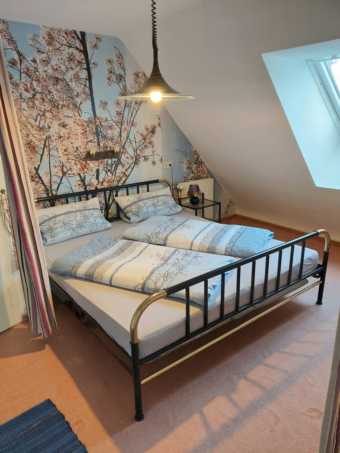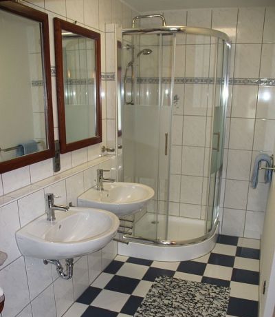 Tageslicht, WC, zwei Waschbecken, Dusche, Fön, Handtücher vorhanden