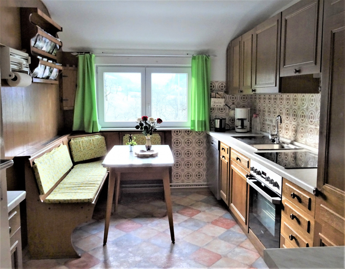Einbauküche mit Kühl-/Gefrierkombi, Herd mit Cerankochfeld, Backofen, Geschirrspüler, Kaffeemaschine, Wasserkocher, Toaster, Geschirr und Besteck,